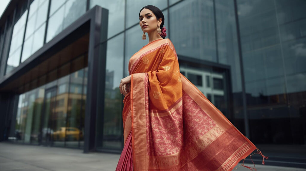 Your modern silk saree choices now include innovative corn-based nylon and silk blends that revolutionize comfort. These lightweight fabrics combine silk’s luxurious feel with enhanced durability and breathability, making them perfect for extended wear throughout your day.