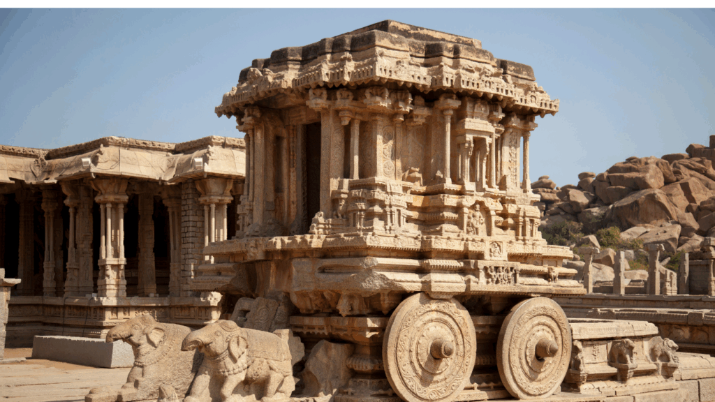 Vittala’s stone chariot—temple on wheels for Vishnu idol parades—steals breaths, wheels pivoting faintly (locked post-damage). Dedicated 1429, pinnacle of Vijayanagara style: kalyana mandapa’s 56 musical pillars chime seven notes when struck (guides demo softly). Cloistered enclosure, three gopurams frame Garuda shrine. Sodeho tank’s stepped Islamic arches reflect lotus motifs. Sculptures depict daily life: women gossiping, wrestlers, musicians—humanity frozen in granite. Sunset shadows animate carvings, evoking Raya’s court.